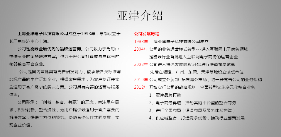 上海亞津電子科技有限公司主要生產和銷售各種電子秤,電子臺秤,電子地磅,高精度電子秤、汽車衡、電子吊秤、電子鋼瓶 秤、叉車秤、防爆秤、衡器配件等衡器稱重產品,同時誠招全國代理商,歡迎廣大客戶來電咨詢!我們將為您提供優質 的服務!